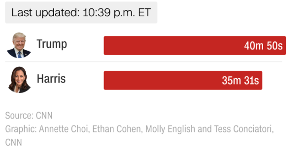 Debati presidencial në Filadelfia, zgjati afërsisht 90 minuta, teksa ish-presidenti Donald Trump kishte folur për rreth 40 minuta e 50 sekonda, ndërsa zëvendëspresidentja Kamala Harris përdori afërsisht 35 minuta e 31 sekonda.