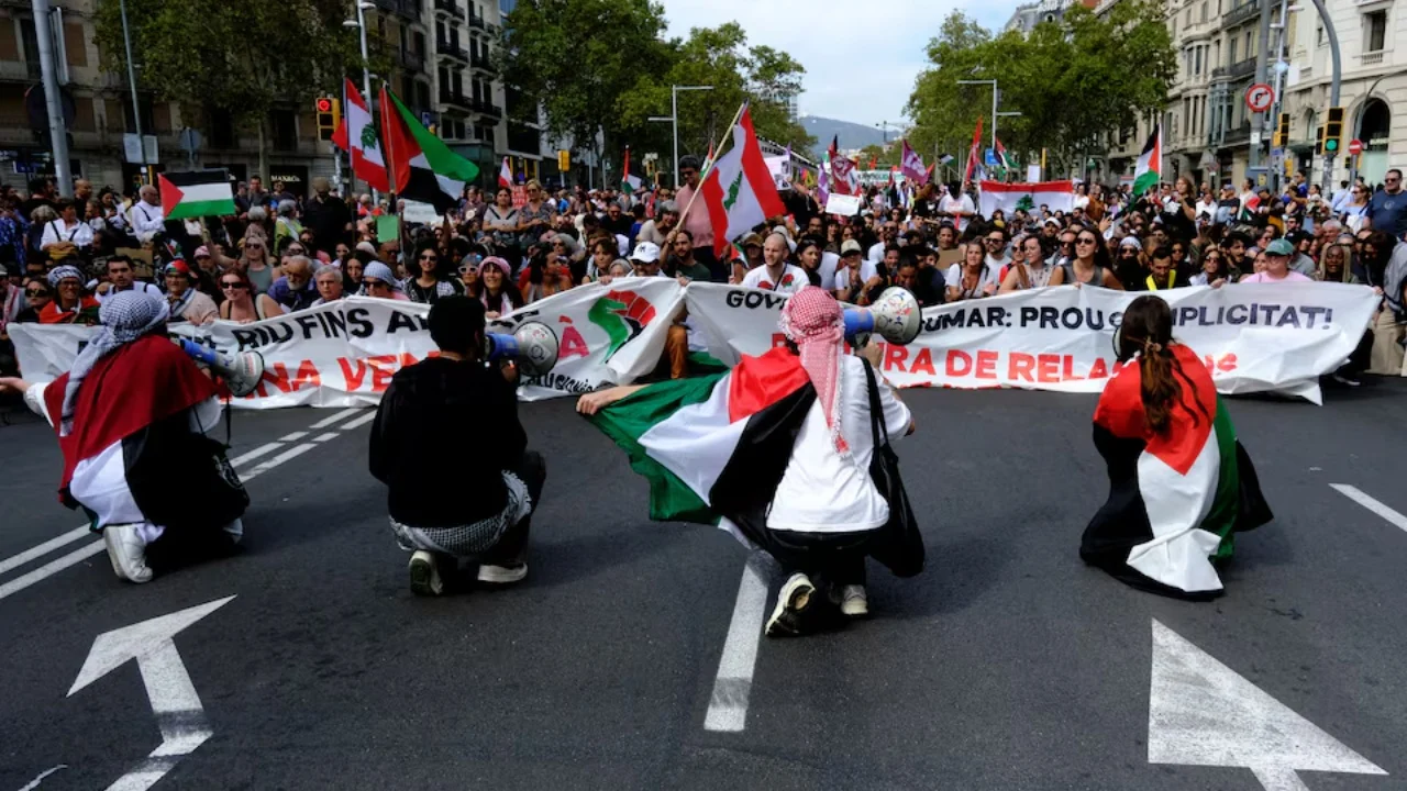 Mijëra demonstrues pro-palestinezë protestuan në qytete anembanë botës të dielën në prag të përvjetorit të parë të sulmit vdekjeprurës të 7 tetorit të Hamasit ndaj Izraelit që shkaktoi luftën në Gaza .