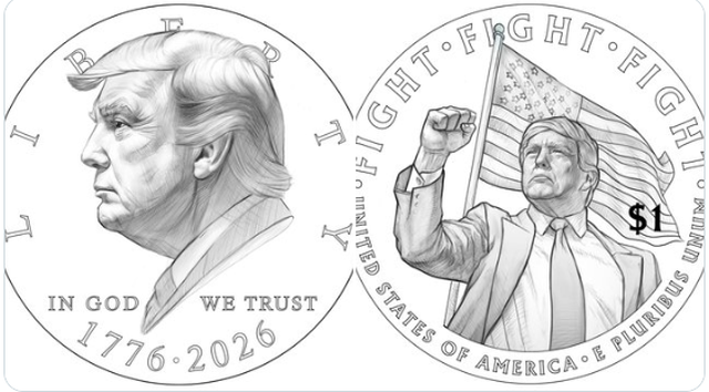 Në anën tjetër të monedhës, ai do të jetë i paraqitur me grushtin e ngritur përpara një flamuri amerikan, bashkë me frazën “LUFTO, LUFTO, LUFTO”, një thënie e përdorur nga Trump gjatë një fjalimi, në përgjigje të tentativës për atentat ndaj tij në korrik 2024, gjatë fushatës presidenciale.