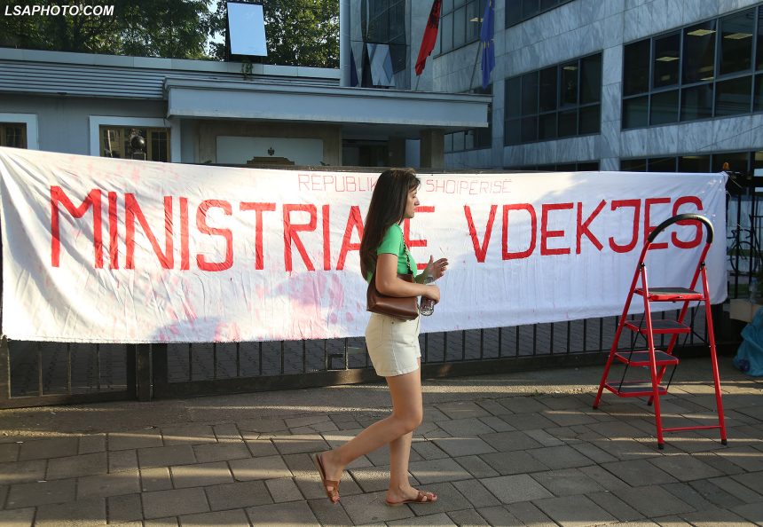 Qytetarë hapin një banderolë me shkrimin “Ministria e Vekjes” para Ministrisë se Shendetësise dhe Mirëqenies Sociale, pas skandalit tek spitali i Onkologjikut, ku mjekët kishin krijuar një skeme abuzive | Foto: LSA