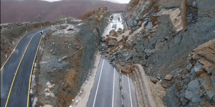 Pamjet nga vendi i ngjarjes tregojnë degradimin e shpejtë të një vepre që sapo ishte inauguruar, masa gjigande shkëmbore të rrëzuara mbi asfalt, barriera të shtrembëruara si fletë kartoni dhe një segment i tërë, i shkatërruar brenda pak sekondash.